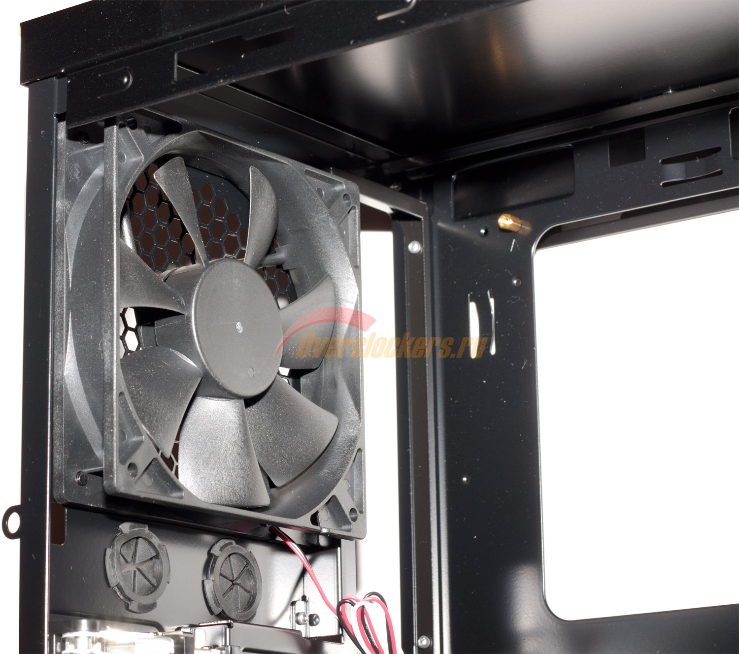 Однако с прокладкой провода питания процессора (ATX12V) при сборке системного блока возникли затруднения. Вырез расположен высоко и за кромкой, и протиснуть туда кабель удалось с трудом. Скорее всего, данное отверстие служит для прокладки через него провода питания заднего вентилятора.
