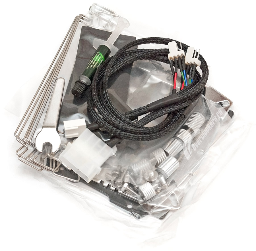 На этом – все. Совсем неплохо! Кулер укомплектован всем необходимым, включая шприц с термопастой, которой хватит на несколько установок, и инструмент для сборки крепления. Можно отметить несколько приятных мелочей – так, производитель не забыл привести инструкции по сборке на русском языке, а в коробке нашлись «необязательные» скобы для подвески третьего вентилятора. Надежность упаковки позволяет не беспокоиться за сохранность радиатора даже при дальних пересылках по почте.