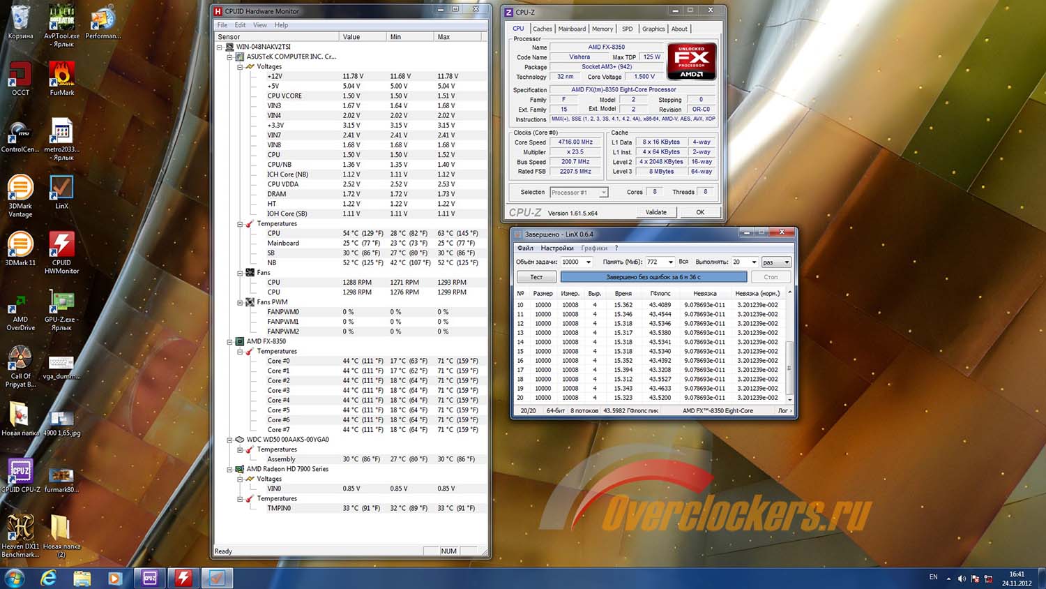 В который уже раз включаю, проверяю. Загружаю операционную систему и смотрю температуры при помощи программы HWMonitor. Запускаю LinX.
