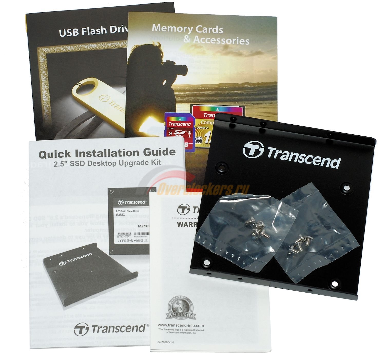 Комплект поставки продукта Transcend небогат: два рекламных буклета, нахваливающих продукцию компании, инструкция и гарантийный буклет, а также переходник с формата 2.5’’ на 3.5’’ с крепежными болтами для установки накопителя.