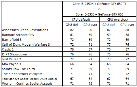 Сводная таблица производительности Core i5-2550К + GeForce GTX 650 Ti и Core i5-3330 + GeForce GTX 660, где за 100% взят результат Core i5-3330 + GeForce GTX 660