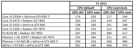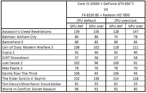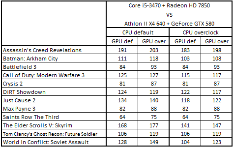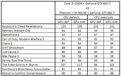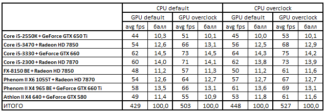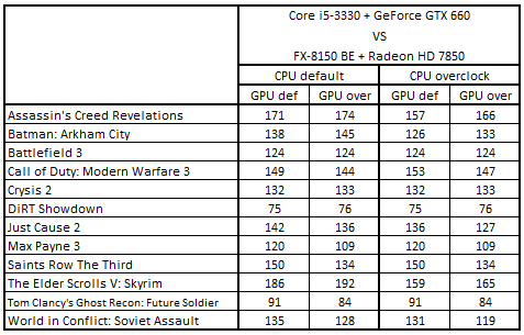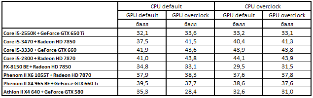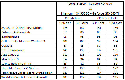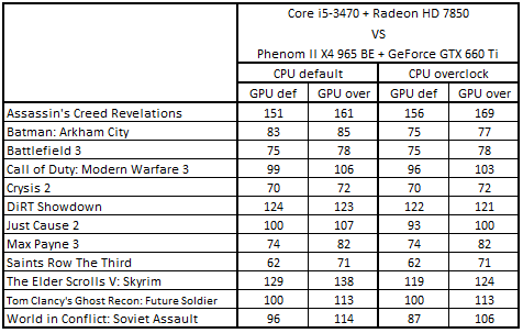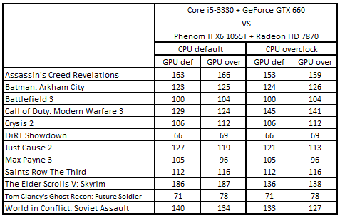 После повышения тактовых частот процессоров и с ускорителями, работающими в номинальном режиме, расклад сил стал выглядеть следующим образом: Core i5-3330 + GeForce GTX 660, Core i5-2300 + Radeon HD 7870, Phenom II X4 965 BE + GeForce GTX 660 Ti и Phenom II X6 1055T + Radeon HD 7870. Разгон видеокарт не повлиял на первые три места, но привел к смене обладателя четвертой строчки: система Core i5-3470 + Radeon HD 7850 вытеснила Phenom II X6 1055T + Radeon HD 7870.