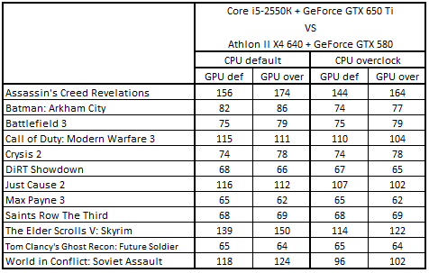 Сводная таблица производительности Core i5-2550К + GeForce GTX 650 Ti и Athlon II X4 640 + GeForce GTX 580, где за 100% взят результат Athlon II X4 640 + GeForce GTX 580