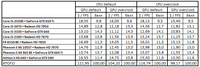 При номинальных режимах работы CPU и GPU оптимальными для покупки были следующие системы: Core i5-3330 + GeForce GTX 660, Core i5-2300 + Radeon HD 7870 и Phenom II X4 965 BE + GeForce GTX 660 Ti.