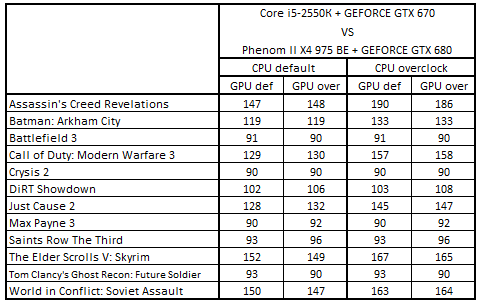 Сводная таблица производительности Core i5-2550К + GeForce GTX 670 и Phenom II X4 975 BE + GeForce GTX 680, где за 100% взят результат Phenom II X4 975 BE + GeForce GTX 680