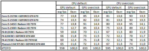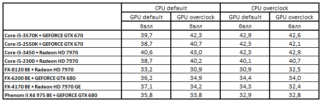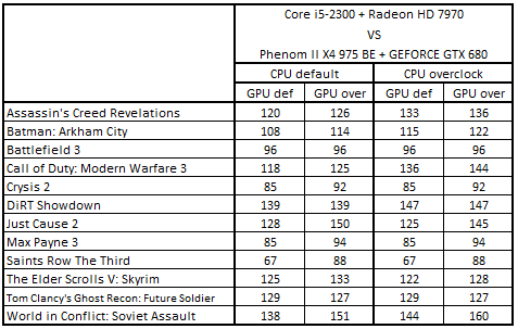 При штатном режиме работы процессора и разогнанной видеокарте оптимальными для покупки были следующие конфигурации: Core i5-3450 + Radeon HD 7970, Core i5-3570К + GeForce GTX 670, Core i5-2300 + Radeon HD 7970 и Core i5-2550К + GeForce GTX 670.
