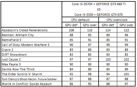 Сводная таблица производительности Core i5-3570К + GeForce GTX 660 Ti и Core i5-3330 + GeForce GTX 670, где за 100% взят результат Core i5-3330 + GeForce GTX 670