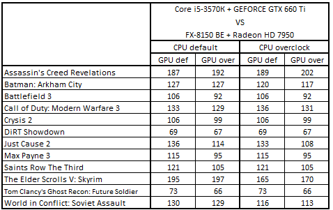 Сводная таблица производительности Core i5-3570К + GeForce GTX 660 Ti и FX-8150 BE + Radeon HD 7950, где за 100% взят результат FX-8150 BE + Radeon HD 7950