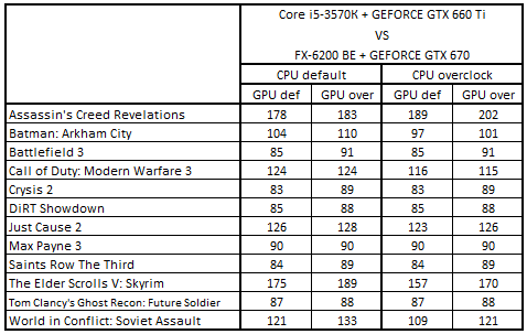 Сводная таблица производительности Core i5-3570К + GeForce GTX 660 Ti и FX-6200 BE + GeForce GTX 670, где за 100% взят результат FX-6200 BE + GeForce GTX 670