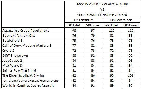 Сводная таблица производительности Core i5-2500К + GeForce GTX 580 и Core i5-3330 + GeForce GTX 670, где за 100% взят результат Core i5-3330 + GeForce GTX 670