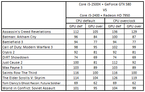Сводная таблица производительности Core i5-2500К + GeForce GTX 580 и Core i5-2400 + Radeon HD 7950, где за 100% взят результат Core i5-2400 + Radeon HD 7950