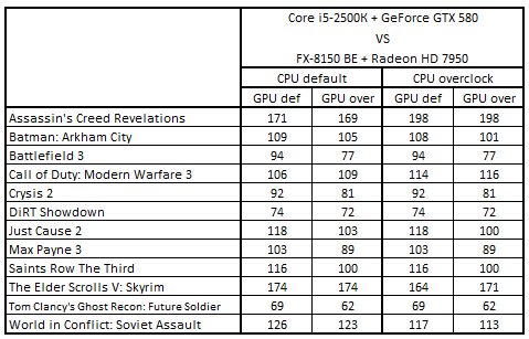 Сводная таблица производительности Core i5-2500К + GeForce GTX 580 и FX-8150 BE + Radeon HD 7950, где за 100% взят результат FX-8150 BE + Radeon HD 7950