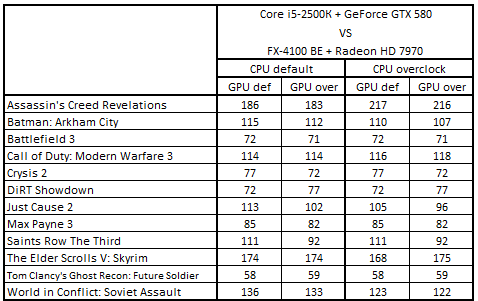 Сводная таблица производительности Core i5-2500К + GeForce GTX 580 и FX-4100 BE + Radeon HD 7970, где за 100% взят результат FX-4100 BE + Radeon HD 7970