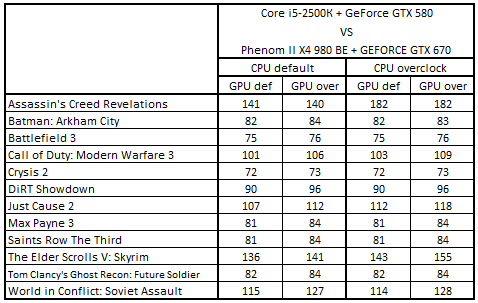 Сводная таблица производительности Core i5-2500К + GeForce GTX 580 и Phenom II X4 980 BE + GeForce GTX 670, где за 100% взят результат Phenom II X4 980 BE + GeForce GTX 670