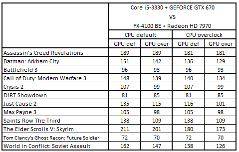 Сводная таблица производительности Core i5-3330 + GeForce GTX 670 и FX-4100 BE + Radeon HD 7970, где за 100% взят результат FX-4100 BE + Radeon HD 7970