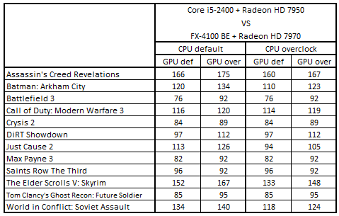 Сводная таблица производительности Core i5-2400 + Radeon HD 7950 и FX-4100 BE + Radeon HD 7970, где за 100% взят результат FX-4100 BE + Radeon HD 7970