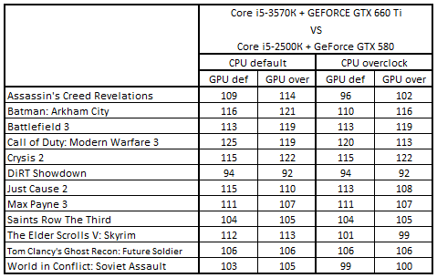 Сводная таблица производительности Core i5-3570К + GeForce GTX 660 Ti и Core i5-2500К + GeForce GTX 580, где за 100% взят результат Core i5-2500К + GeForce GTX 580