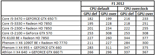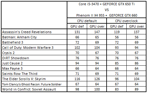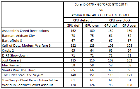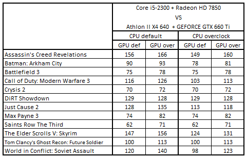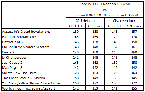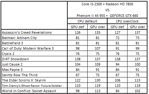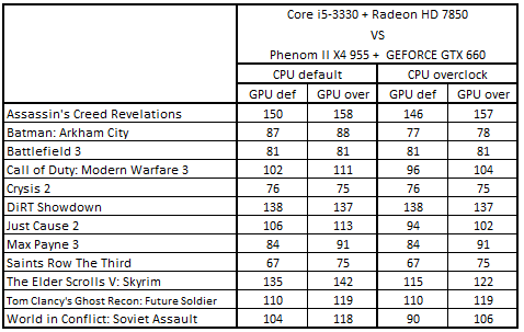 После разгона процессоров первое и второе места заняли Phenom II X4 955 + GeForce GTX 660 и Athlon II X4 640 + GeForce GTX 660 Ti, а третье и четвертое – Core i5-3330 + Radeon HD 7850 и Core i5-2300 + Radeon HD 7850. Повышение частоты GPU привело к тому, что Core i5-3330 + Radeon HD 7850 поднялась на первую строчку, заменив связку Phenom II X4 955 + GeForce GTX 660, а система Core i5-2300 + Radeon HD 7850 расположилась на третьем месте.