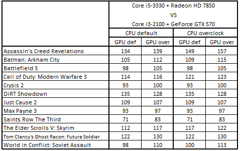 При штатном режиме работы ЦП и с разогнанным ускорителем оптимальными для покупки были следующие конфигурации: Core i5-3330 + Radeon HD 7850 и Core i5-2300 + Radeon HD 7850.