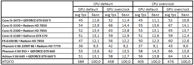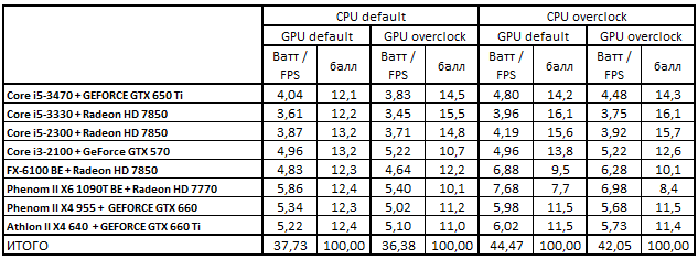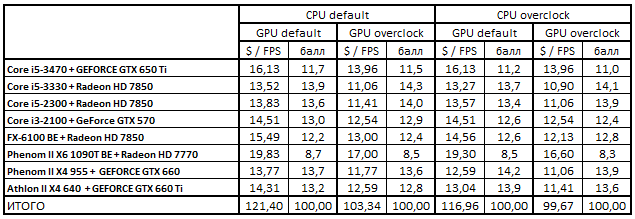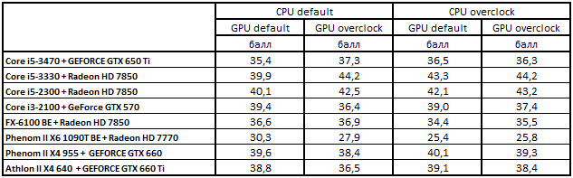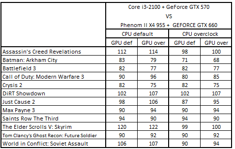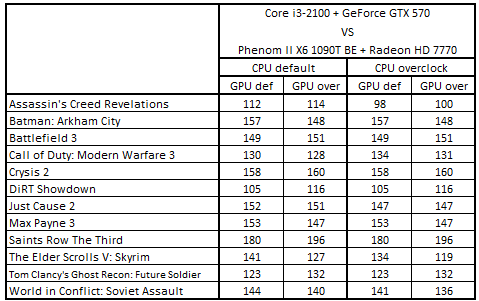 В номинальном режиме работы компонентов первая четверка лидеров расположилась в следующем порядке: Core i5-3330 + Radeon HD 7850, Phenom II X4 955 + GeForce GTX 660, Core i5-2300 + Radeon HD 7850 и Core i3-2100 + GeForce GTX 570. После разгона графических ускорителей связка Core i5-2300 + Radeon HD 7850 заняла вторую позицию, вытеснив с нее конфигурацию Phenom II X4 955 + GeForce GTX 660.