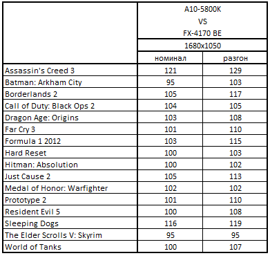 Сводная таблица производительности A10-5800K и FX-4170 ВЕ, где за 100% взят результат FX-4170 ВЕ