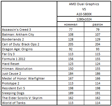Несмотря на посредственные результаты, связка A10-5800K + Radeon HD 6670 1024 Мбайт, работающая с включенной технологией AMD Dual Graphics, смогла обеспечить приемлемую производительность.