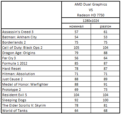 - AMD Dual Graphics медленнее Radeon HD 7770 1024 Мбайт на 46% - 52%.