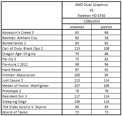- AMD Dual Graphics медленнее Radeon HD 6750 1024 Мбайт на 10% - 12%.