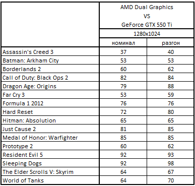 - AMD Dual Graphics медленнее GeForce GTX 550 Ti 1024 Мбайт на 46% - 54%.