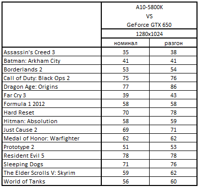 Сводная таблица производительности A10-5800К и GeForce GTX 650 1024 Мбайт, где за 100% взят результат GeForce GTX 650 1024 Мбайт