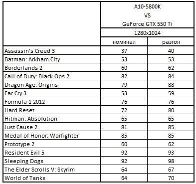 Сводная таблица производительности A10-5800К и GeForce GTX 550 Ti 1024 Мбайт, где за 100% взят результат GeForce GTX 550 Ti 1024 Мбайт