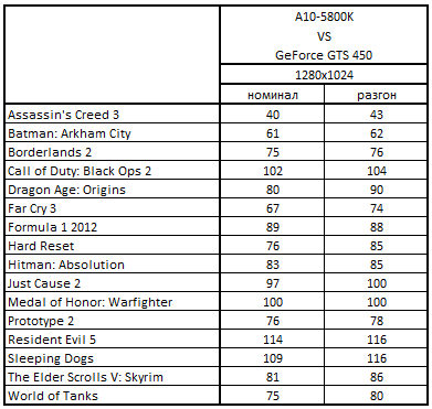 Сводная таблица производительности A10-5800К и GeForce GTS 450 1024 Мбайт, где за 100% взят результат GeForce GTS 450 1024 Мбайт