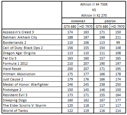 - Для системы с GeForce GTX 680 2048 Mбайт, работающей после разгона, оптимальными будут процессоры Athlon II X4 750K и Athlon II X4 740.