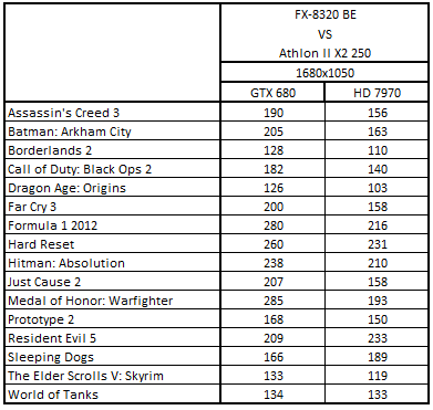 При изучении вопроса влияния видеоподсистемы на эффективность процессоров, между показателями, полученными при использовании GeForce GTX 680 2048 Мбайт и Radeon HD 7970 3072 Мбайт, большой разницы обнаружено не было. Вернее, наблюдались приблизительно одинаковые тенденции. Заметные отличия выявились только в случае с трехъядерными версиями Phenom II и Athlon II – с графическим ускорителем AMD они показали меньшее отставание от четырехъядерных CPU, нежели в системе с картой NVIDIA.