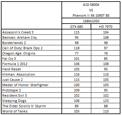 - A10-5800K (TC-off, DDR3 - 1866 МГц) медленнее Phenom II X6 1090T BE (TC-off, DDR3 - 1600 МГц) на 17% - 24%.