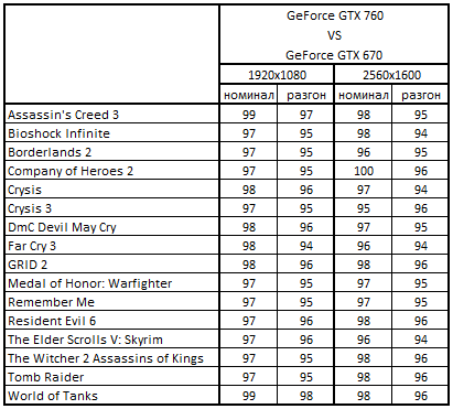 Сводная таблица производительности GeForce GTX 760 2048 Мбайт и GeForce GTX 670 2048 Мбайт, где за 100% взят результат GeForce GTX 670 2048 Мбайт