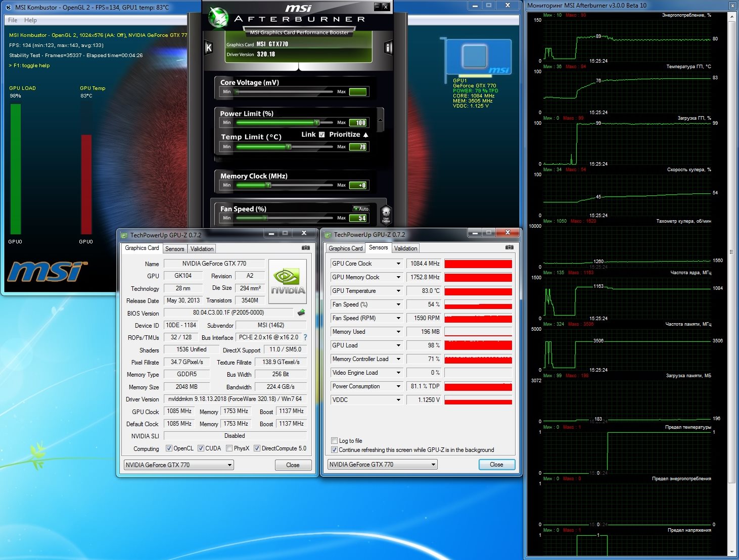 Посмотрим, как поведет себя видеокарта при нагрузке фирменным приложением MSI Kombustor.