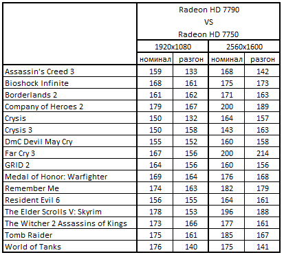 Можно отметить, что графический ускоритель Radeon HD 7790 2048 Мбайт показал относительно высокие результаты в разрешении 1920х1080, однако при переходе к 2560х1600 у него возникли серьезные проблемы с обеспечением приемлемой производительности.