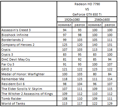 Сводная таблица производительности Radeon HD 7790 2048 Мбайт и GeForce GTX 650 1024 Mбайт, где за 100% взят результат GeForce GTX 650 1024 Mбайт
