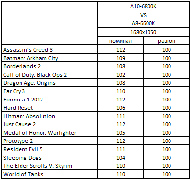 Сводная таблица производительности A10-6800K и A8-6600K, где за 100% взят результат A8-6600K