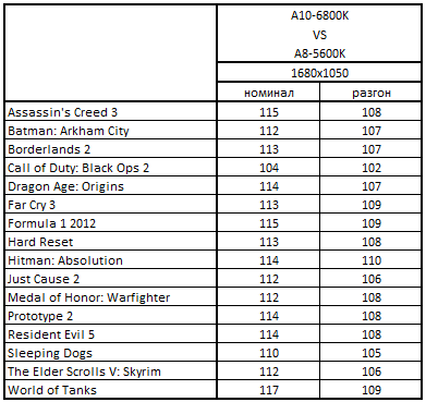 Сводная таблица производительности A10-6800K и A8-5600K, где за 100% взят результат A8-5600K