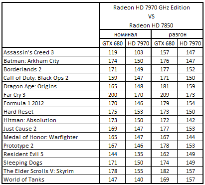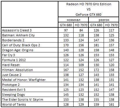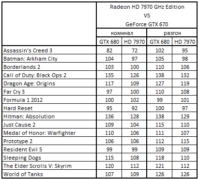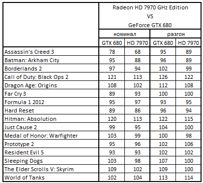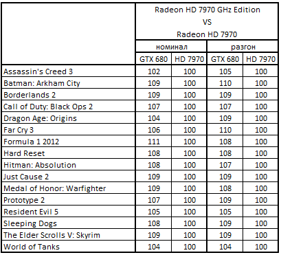 Сводная таблица производительности Radeon HD 7970 GHz Edition 3072 Мбайт и GeForce GTX 680 2048 Mбайт, где за 100% взят результат GeForce GTX 680 2048 Mбайт