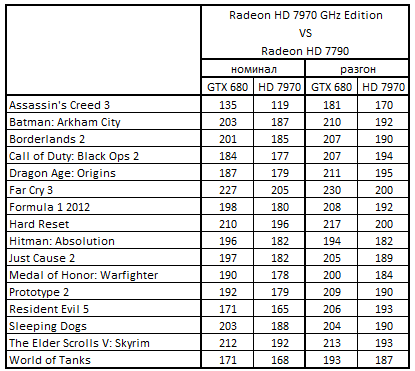 Сводная таблица производительности Radeon HD 7970 GHz Edition 3072 Мбайт и Radeon HD 7790 2048 Мбайт, где за 100% взят результат Radeon HD 7790 2048 Мбайт