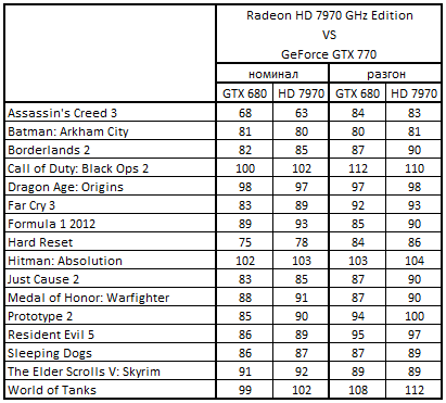 Сводная таблица производительности Radeon HD 7970 GHz Edition 3072 Мбайт и GeForce GTX 770 2048 Mбайт, где за 100% взят результат GeForce GTX 770 2048 Mбайт