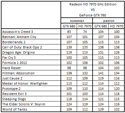 Сводная таблица производительности Radeon HD 7970 GHz Edition 3072 Мбайт и GeForce GTX 760 2048 Mбайт, где за 100% взят результат GeForce GTX 760 2048 Mбайт