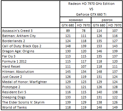 Сводная таблица производительности Radeon HD 7970 GHz Edition 3072 Мбайт и GeForce GTX 660 Ti 2048 Mбайт, где за 100% взят результат GeForce GTX 660 Ti 2048 Mбайт