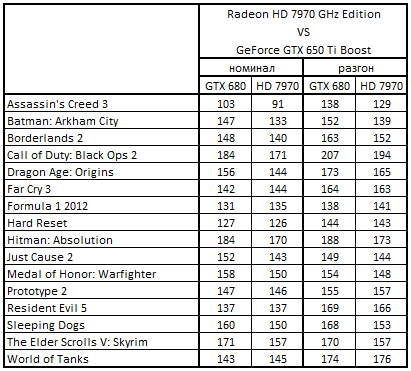 Сводная таблица производительности Radeon HD 7970 GHz Edition 3072 Мбайт и GeForce GTX 650 Ti Boost 2048 Mбайт, где за 100% взят результат GeForce GTX 650 Ti Boost 2048 Mбайт