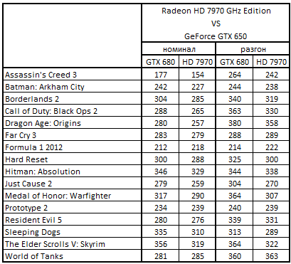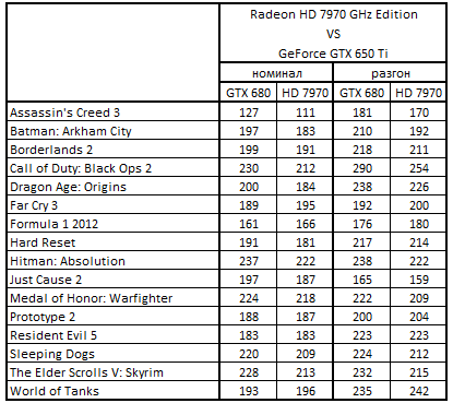 Сводная таблица производительности Radeon HD 7970 GHz Edition 3072 Мбайт и GeForce GTX 650 1024 Mбайт, где за 100% взят результат GeForce GTX 650 1024 Mбайт