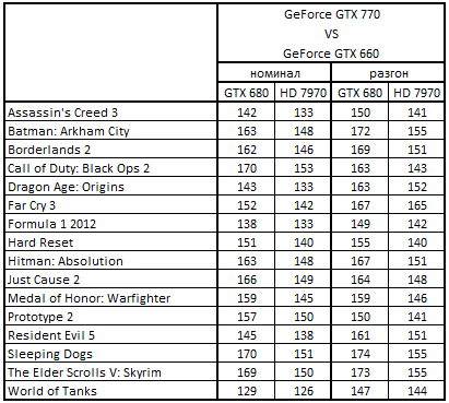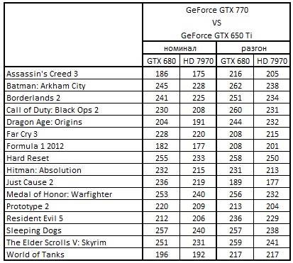 Сводная таблица производительности GeForce GTX 770 2048 Mбайт и GeForce GTX 680 2048 Mбайт, где за 100% взят результат GeForce GTX 680 2048 Mбайт
