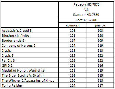 Сводная таблица производительности Radeon HD 7870 2048 Мбайт (Core i7-3770K) и Radeon HD 7850 2048 Мбайт (Core i7-3770K), где за 100% взят результат Radeon HD 7850 2048 Мбайт (Core i7-3770K)